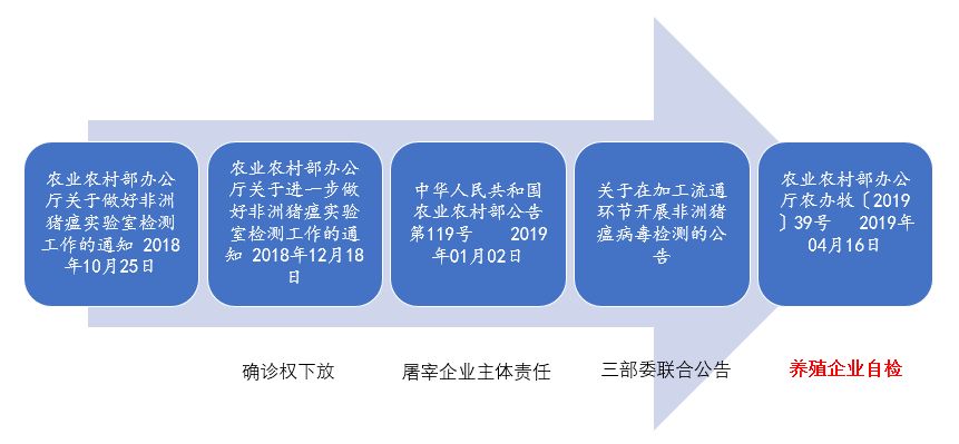 二、鼓励规模猪场和种猪场开展非洲猪瘟自检。鼓励规模猪场、种猪场配置检测仪器设备,规范使用经我部批准或经中国动物疫病预防控制中心比对符合要求的检测方法,自行开展非洲猪瘟检测。 三、严格落实防疫主体责任。各级畜牧兽医部门要督促养猪场户进一步落实防疫主体责任,主动加强动物防疫设施建设,配备非洲猪瘟检测仪器设备,配齐配足消毒药品和其他配套物资。 ——《农业农村部办公厅关于加强养殖环节非洲猪瘟疫情排查工作的通知》 1. 猪场是疫情防控的责任主体。 2. 主动监测可以及早捕捉疫情的苗头。 3. 基于风险分析和评估,对高危因素进行病原检测。 4. 早处置病死猪及周围高风险猪群,将疫情扼杀在萌芽状态。 5. 立足自救,主动检测,早检测、早发现、早“拔牙”。 ——《非洲猪瘟肆虐下规模化猪场如何活下来?》仇华吉