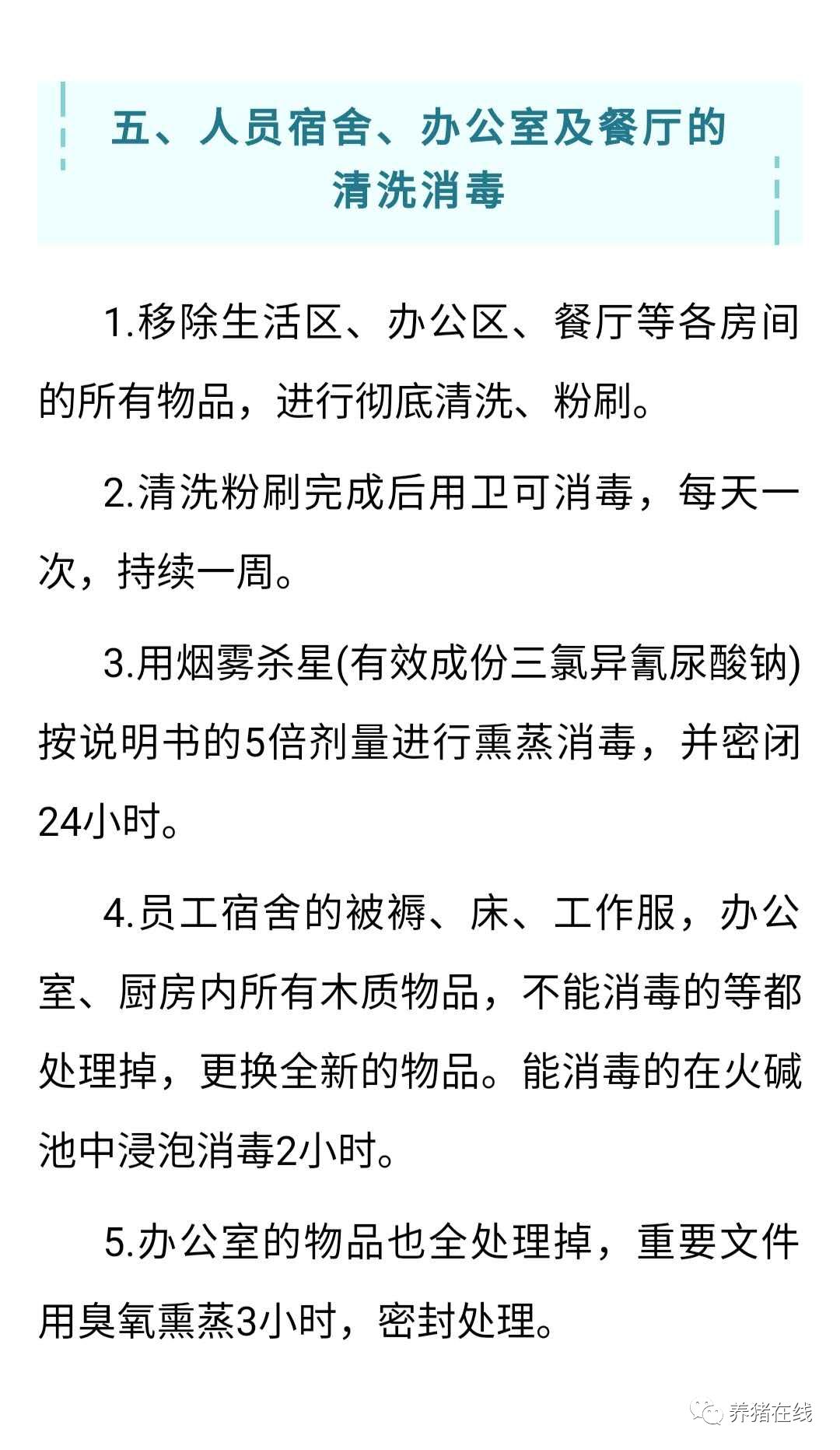 三、猪舍的清洗 清场完成后,对全场进行彻底清洗: 1.去除木质材料的物品与设备进行焚烧处理。 2.如果猪场有裸露的土壤,要更换30cm的表层土壤并全面进行水泥硬化。 3.粪便污水进行无害化处理,清空粪水池和地坑中的粪水,并进行无害化处理(如发酵45天),并彻底进行清洗消毒,达到清洁如新的程度。 4.猪舍内的清洗 ①猪舍内能拆下来的设备都拆下来,如有条件把定位栏、产床、产床漏缝板都拆下来放在火碱池浸泡。 ②先进行清扫、冲洗,再用2%火碱溶液全部喷洒,并浸泡2小时,然后再将栏舍从上到下彻底清洗。 ③猪舍从上到下彻底进行高压清洗。 ④清洗一遍干燥后,再次重新清洗一遍。 ⑤清洗后的检查。重点检查漏缝板缝隙和背面、设备有拐角处、焊点、水线的弯头等死角。用白色的纸巾擦拭各处,白色纸巾无污渍为清洗合格标准。 5.水线的清洗 ①卸下所有饮水器、接头等,放在火碱池中浸泡2小时。 ②水线表面在猪舍清洗过程中完成彻底清洗,并通过检查合格。 ③关上总开关,在水箱/蓄水池中加入含有效氯3%的氯制剂消毒剂,浸泡2小时。 ④当饮水器重新装好后,打开猪场最远端的饮水器,使蓄水池中的消毒水注满整个管道,并浸泡2小时以上。浸泡完成后,放掉水管道内的消毒水,再注入清水。 6.在场建设一个深60cm,长3米,宽1.5米的水池,并注水到40cm处,然后倒入36kg火碱(配成约2%的氢氧化钠溶液),根据猪场情况,建合适大小的火碱池,如果要浸泡所有定位栏和产床需要更大的火碱池。 7.猪舍内能拆卸的物品都拆下来,彻底清洗后放到火碱池浸泡2小时。分批浸泡,每次浸泡前重新添加10kg火碱。5批更换一次消毒液,所有使用火碱浸泡后的物品,均需用清水进行清洗和干燥。 8.木制的屋顶经过消毒后,用PVC板吊顶。 六、生物安全设施建设与升级 排查生物安全漏洞,借空舍之际完成生物安全设施升级(如中转装猪台、物资熏蒸室、农场洗消站等)。 七、检测 完成猪场的清洗消毒后,多点采样(猪舍、粪沟、路面、漏缝板背面、屋顶、办公室、宿舍、厨房等),用PCR检测ASF病毒,检测全为阴性,表示清洗消毒工作完成。 八、哨兵试养 引入一批断奶仔猪作为哨兵猪试养: 1.引入前对所有哨兵猪进行ASF检测,确定阴性后再引入。 2.采用全封密猪车拉猪,避免运输过程中的交叉感染的风险。 3.运输过程中的生物安全:尽量晚上运猪、不停车、不进服务区、司机不下车。 4.饲喂至育肥出栏,如有病死猪,送权威机构检测。 5.卖猪后再次采集猪舍环境、舍外地面、猪场内车辆等处样本,送权威机构检测ASF病毒。 6.多点多次、多时间段检验,确保安全后,才能复产。 7. 引哨兵猪时,可以多引二元母猪,检测ASF阴性,成功的可直接留种。 8. 每栏饲养2-3头哨兵猪,尽量每个栏舍均有哨兵猪。 十、检测