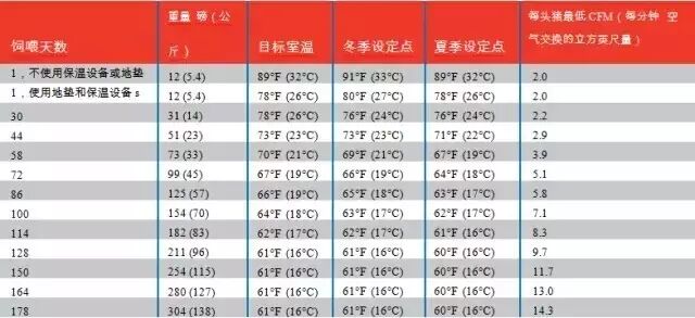表1是生长猪的建议猪舍温度和最低空气交换率(请注意,使用保温箱时可以降低目标室温)。