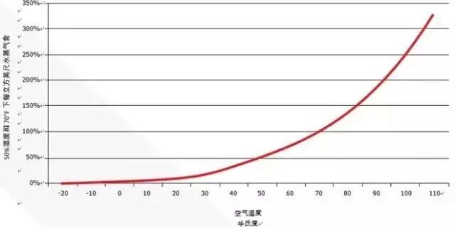 相对湿度是指在一定温度下,空气中的水蒸汽的实际含量与最大水蒸汽含量的百分比。随着温度的升高,空气可以容纳更多的水分。这种关系如图表1所示,示例:相对湿度相同时,0°F(-18°C)的空气容纳的水是50°F(10°C)的空气的12%。