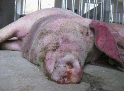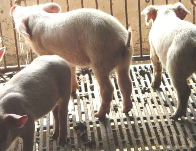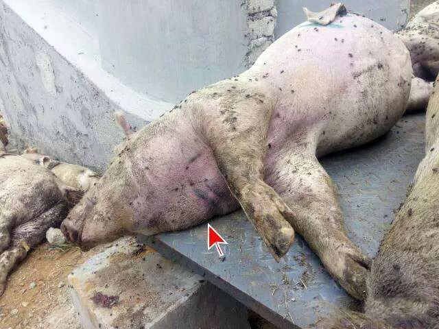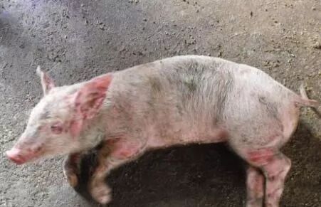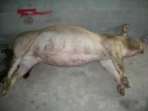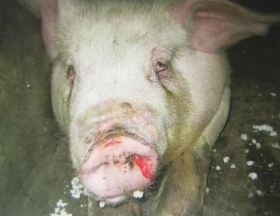 (2)急性感染的猪会出现发热(40—42℃),脚尖着地僵直行走,依靠两边胸前骨侧卧,且不愿走动,厌食和口渴是常见的症状。