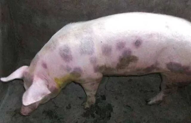 (1) 败血型: 发病急,病程短,往往不见任何异常症状猪突然死亡,间有咳嗽,颈部、耳廓、腹下及四肢下端皮肤呈紫红色,有出血点,出现跛行,病程稍长者,多在3——5天内死亡。