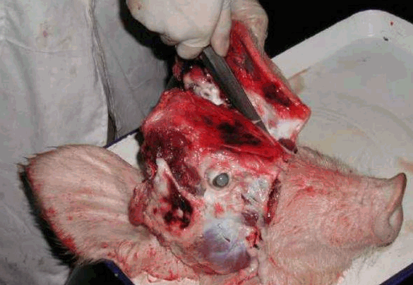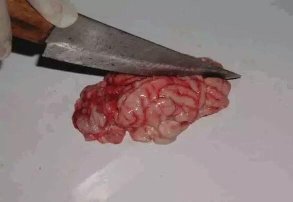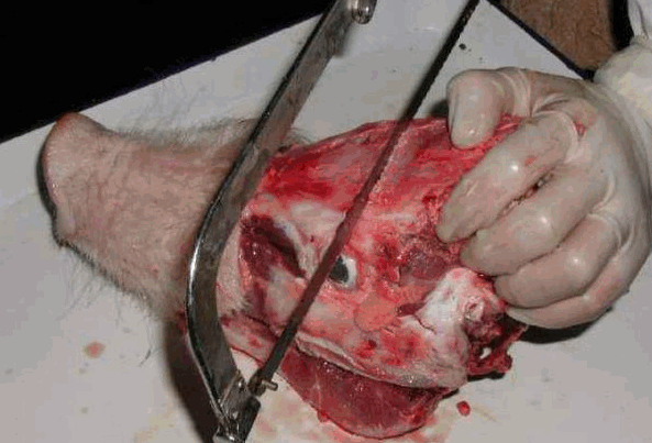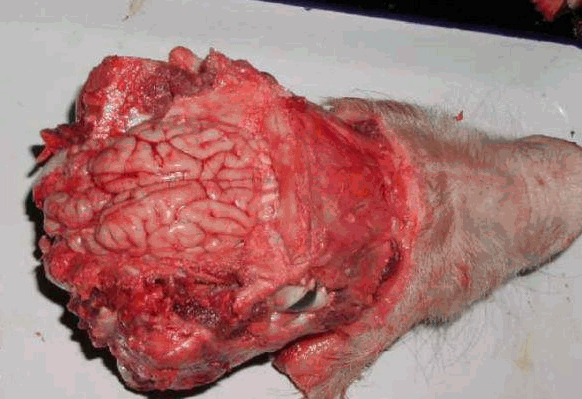清除头部皮肤和肌肉,先在两侧眶上突后缘作一横锯线,从此锯线两端经额骨、顶骨侧面至枕嵴外缘作二平行的锯线,再从枕骨大孔两侧作一"V"形锯线与二纵线相连。此时将头的鼻端向下立起,用槌敲击枕嵴,即可揭开颅顶,露出颅腔。看有无出血点、萎缩、坏死现象。
