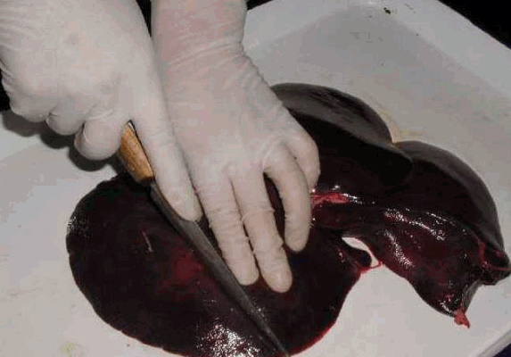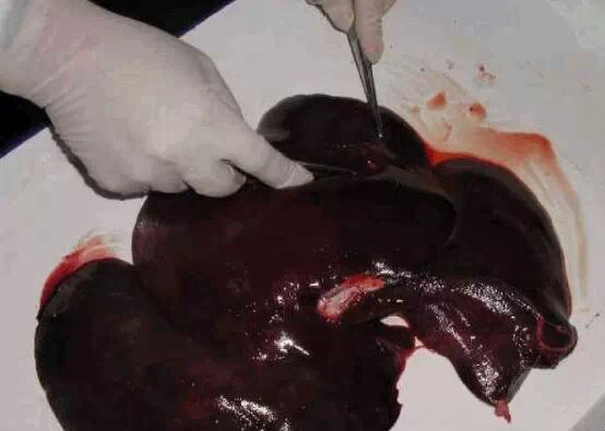 肝:检查肝的颜色、质地等。肝脏是否有坏死,出血,水泡,硬化,肿大,如有坏死灶,可能有弓形体或蛔虫斑引起。如有坏死点,可能有伪狂犬或副伤寒。如肝脏是有拇指大的水泡,可能是囊尾幼病.胆汁变稠---附红细胞。