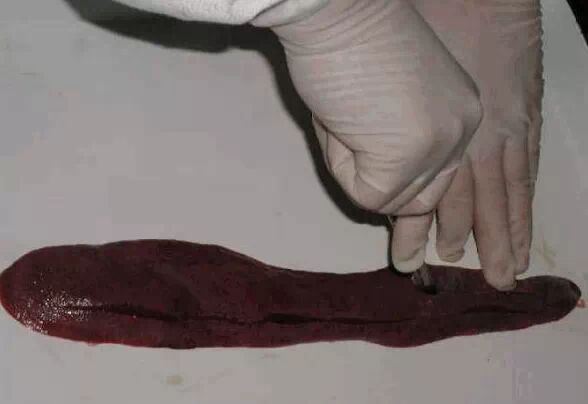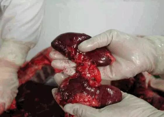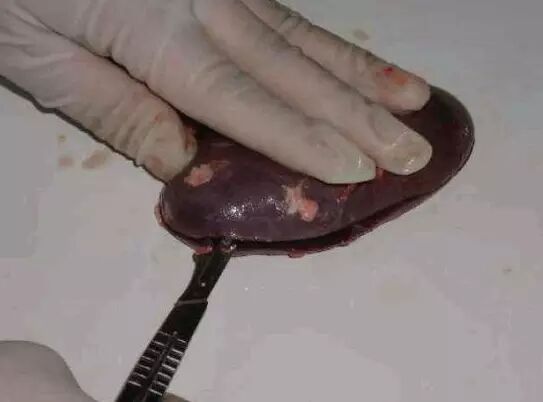 脾:注意脾的大小,重量,颜色,质地,表面和切面的状况。如败血性炭疸时,脾可能高度肿大,色黑红,柔软。急性猪瘟时脾发出血性梗死。脾脏肿大到原来2-3倍,多由链球菌或弓形体引起。如脾脏有锯齿状梗死或出血,多由猪瘟或弓形体引起。如脾脏有血晕样坏样出血点,多由伪狂犬引起。脾有坏死显示是病毒病,因为脾是免疫器官。