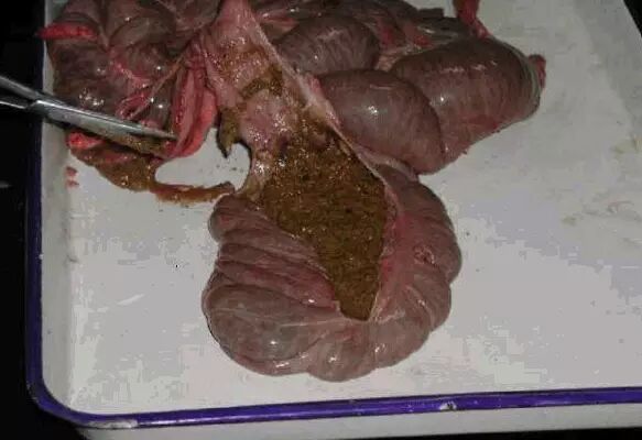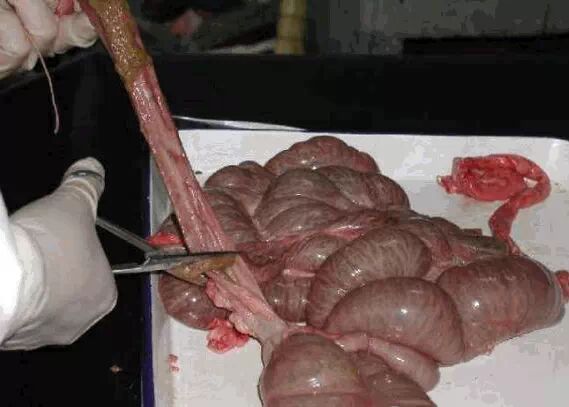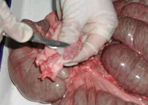 肠:检查肠壁的簿厚,黏膜有无脱落、出血。肠淋巴结有无肿胀等。患猪副伤寒的猪肠黏膜表面覆盖糠麸样物质。肓肠有钮扣样溃疡,出血,糠麸样坏死,如钮扣样溃疡,多有猪瘟引起。如有糠麸样坏死,多有副伤寒,回肠炎引起。