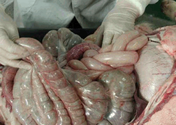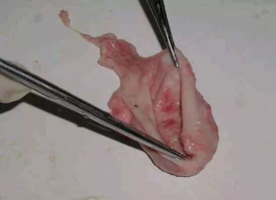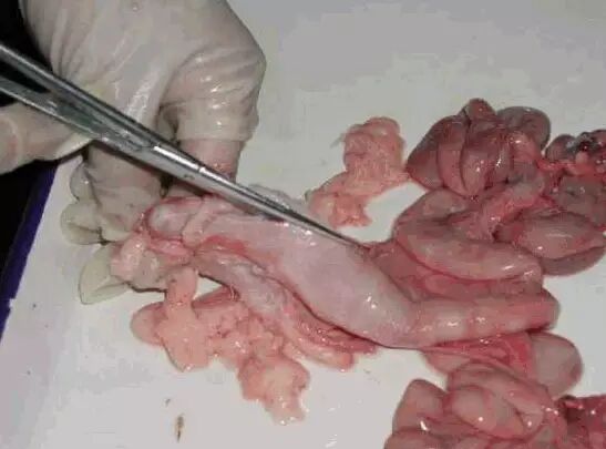 胃:检查胃内容物的性状、颜色,剖去内容物看胃黏膜有无出血、脱落、穿孔、溃疡、水肿等现象。如有胃粘膜有出血块,可能是伪狂犬,如胃溃疡,多有传染性胃肠炎,或中毒性疾病引起。如胃大弯有水肿,多是水肿病引起。