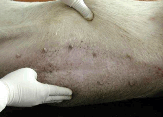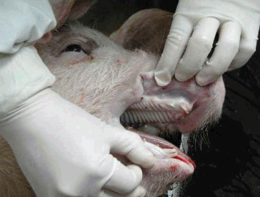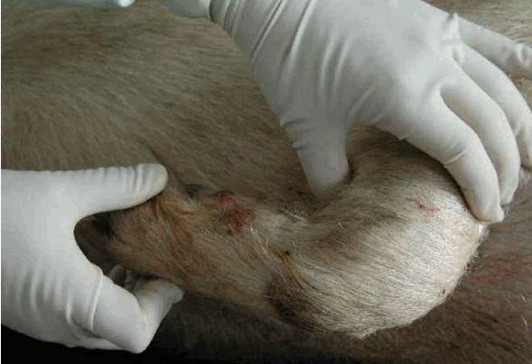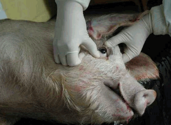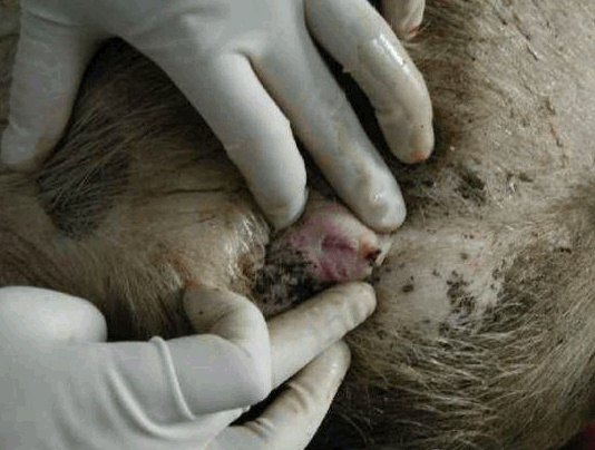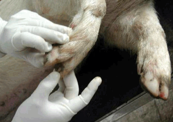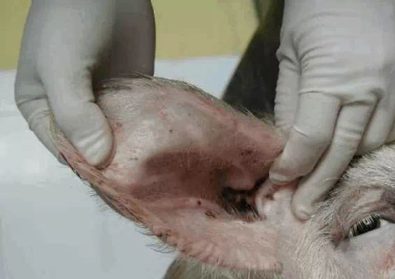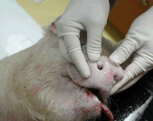 检查四肢、眼结膜的颜色、皮肤等有无异常,下颌淋巴结是否有肿胀现象等。用肉眼观察猪的外观,如皮肤,眼结膜-(苍白---附红细胞,黄疸—败血症---链球菌,猪瘟,付猪嗜血),粪(大便中有粘膜---可能是猪瘟) ,尿(血尿—衣原体,钩端螺旋体),口腔,耳朵(耳朵边上卷---弓形体),鼻腔,腹股沟淋巴结(肿大至3-5倍---圆环病),蹄部。还有,亚急性猪丹毒时,或见到皮肤大小比较一致的方形、菱形或圆形疹块;急性猪瘟,皮肤多有密集的或散在的出血点(或淤血点);口蹄疫时四肢、口腔有水疱;猪疥螨病猪皮肤粗糙有皮屑、背毛脱落、皮肤潮红甚至出血有痂皮;猪链球菌病皮肤有突起的脓包,切开脓包流出淡黄色液体;附红细胞体病时眼结膜黄染。肛门附近有无粪便污染等。