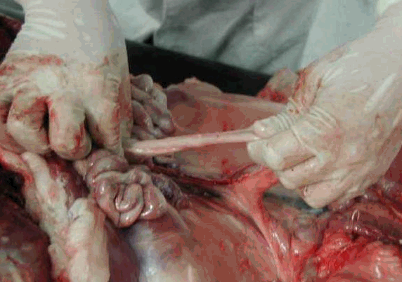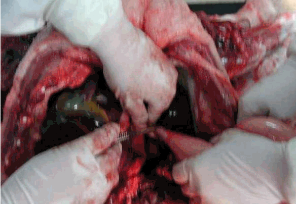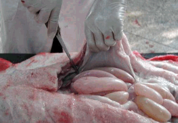 (1)在回盲韧带(将结肠圆椎体向右拉,盲肠向左拉,即可看到回盲韧带), 游离缘双结扎,剪断回肠,在十二指肠道,双结扎剪断十二指肠。左手握住回断端,右手持刀,逐渐切割肠系膜至十二指结扎点,取出空肠和回肠。