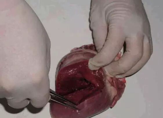 看心脏:如心包有积液,或坏死出血,水肿,纤维素性渗出物。如心包积液,多由败血性疾病引起,如心冠脂肪水肿,可能由圆环病毒引起。如心冠脂肪出血或心内膜出血,多由链球菌或猪瘟起。如有纤维素性炎症,多有胸膜肺炎或副猪嗜血杆菌引起,如心肌坏死或苍白,多由口蹄疫或缺硒引起。看心包膜有无出血点,切开心脏看二尖瓣、三尖瓣有无异常现象。猪丹毒溃疡性心内膜炎,增生,二尖瓣上有灰白色菜花赘生物检查时应特别注意。