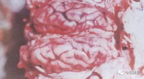 △【猪伪狂犬病】软脑膜充血,其下脑沟积有出血性水肿液