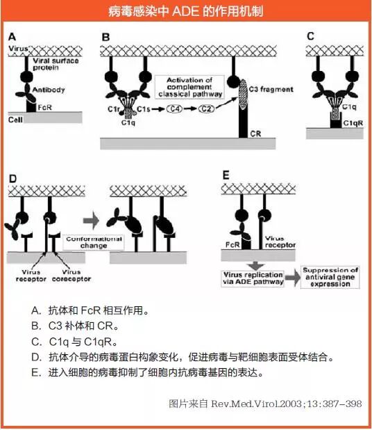 一、病毒、抗体复合物与细胞表面的FcR相互交联提高病毒对细胞的感染率; 二、通过病毒、补体激活成分形成的复合物与细胞上的CR交联提高病毒对细胞的感染率; 三、补体成分C1q与C1qR的相互作用引起ADE; 四、抗体直接激活病毒蛋白增强病毒的感染力; 五、抗体介导的病毒蛋白构象变化,促进病毒与靶细胞表面受体结合; 六、进入细胞内的病毒的复制,抑制了细胞内抗病毒基因的表达。