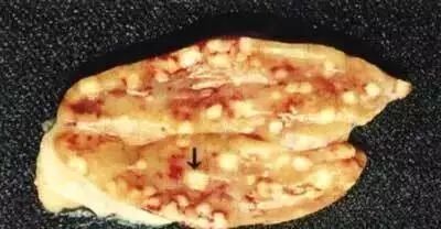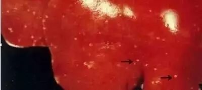 肝脏表面可见散在的坏死点