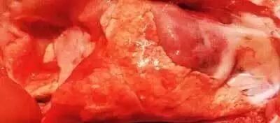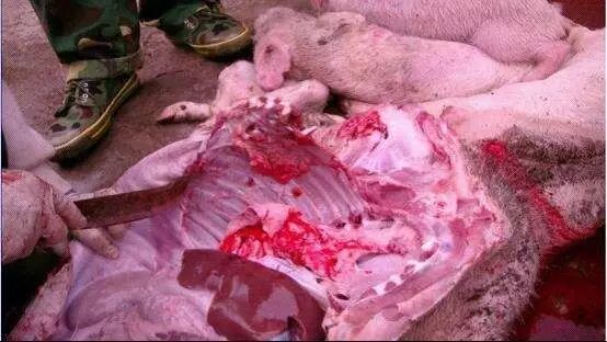 胃无食物,黄色粘液。贲门区发炎。肠道出血炎症。脾头略肿大,边缘有出血梗死。心包积液,心脏外膜不出血,心内膜有少量出血斑;